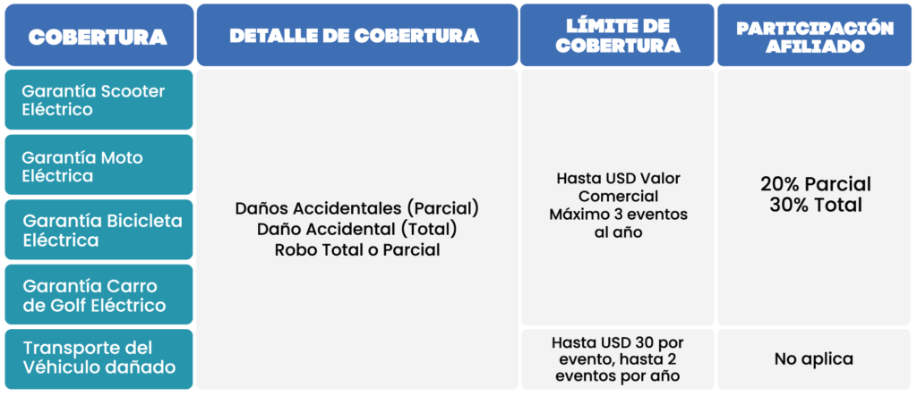 La cobertura y el monto máximo por evento de los servicios ofrecidos, descritos a continuación, se detallan en el siguiente cuadro. Los servicios serán prestados para scooter, motocicleta, bicicleta, carro de golf y vehículos eléctricos, conforme a las condiciones aquí establecidas.
